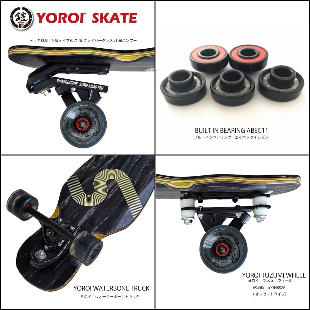 トラックはしなやかなカービングターンを完全バックアップしてくれるYOROI カービング・WAVER トラックを採用。 パワーのあるライディングを楽しめます。デッキテープは、デッキのしなりにサポートするよう、ソフトなクッション性のあるEVAグリップテープを使用だから、足に吸い付くようにデッキをコントロールしやすくなっています。 ウィールは、SHR82A、69×50mmのオフセットタイプなのでターン時にグイっと跳ね返る感覚。 ベアリングは、ビルトインタイプのABEC11。 通常ベアリングは、ABECという工業規格でランク付けされていますが、「11」は、ほぼ最高値。 高速で安定感のあるスムーズなウィール回転を導きます。