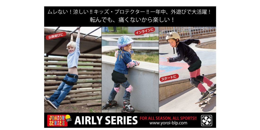 の臀部への衝撃を緩和・吸収するためのヒップ・プロテクターです。これまでスケートボードやローラースケート、自転車などで使われるプロテクターは、ヘルメット・肘・膝・手首が主で、大切な尾てい骨を守る手段がありませんでした。キッズ・プロテクターは、通気性のあるウェットスーツと衝撃吸収力に優れたNBR素材を組み合わせることで、フィット性・快適性・軽量化を実現しています。面ファスナーでとめるだけで簡単に脱着できるので小さい子どもにも着せやすく、服の上からでも下でも着用が可能です。また、素材が水滴をはじくため、少々の雨やぬかるみなら服の中まで濡れるのを防いでくれます。