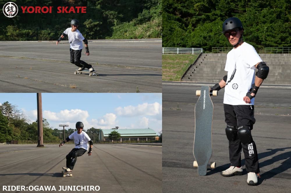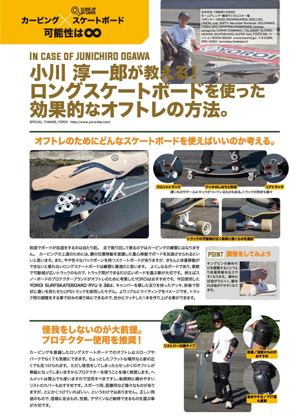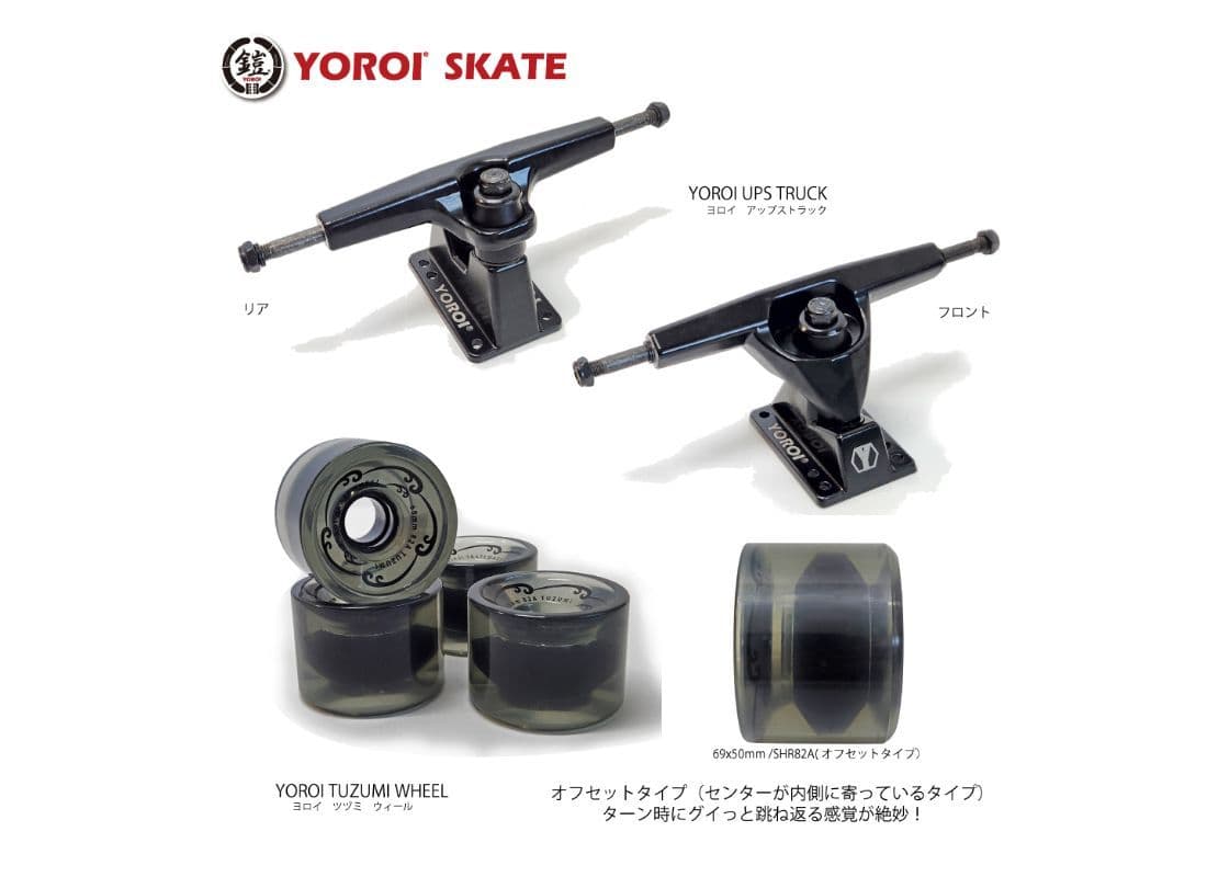 斜面でボードが加速をするのは当たり前。足で振り回して乗るのではカービングの練習にはなりません。カービングの上達のためには、腰の位置移動を意識した重心移動でボードを加速させられるといいと思います。また、今や色々なバックボーンを持つスケートボードがありますが、きちんと体重移動ができないと乗れないロングスケートボードは練習に最適だと思います。よくしなるボードであり、柔軟で可動域が広いトラックのもので、トラック間ができるだけ広いボードを選ぶ事が大切です。スノーボードのプロテクターブランドYOROI🄬がオフトレのために考案しているのでおすすめです。キャンバーを模した反りを持ったデッキ、前後で形状に違いを持たせたUPSトラックを採用したモデル。よりリアルにライディングをイメージでき、トラック間の調整をする事で好みの乗り味にできるので、自分にマッチした1本を作り上げる事ができます